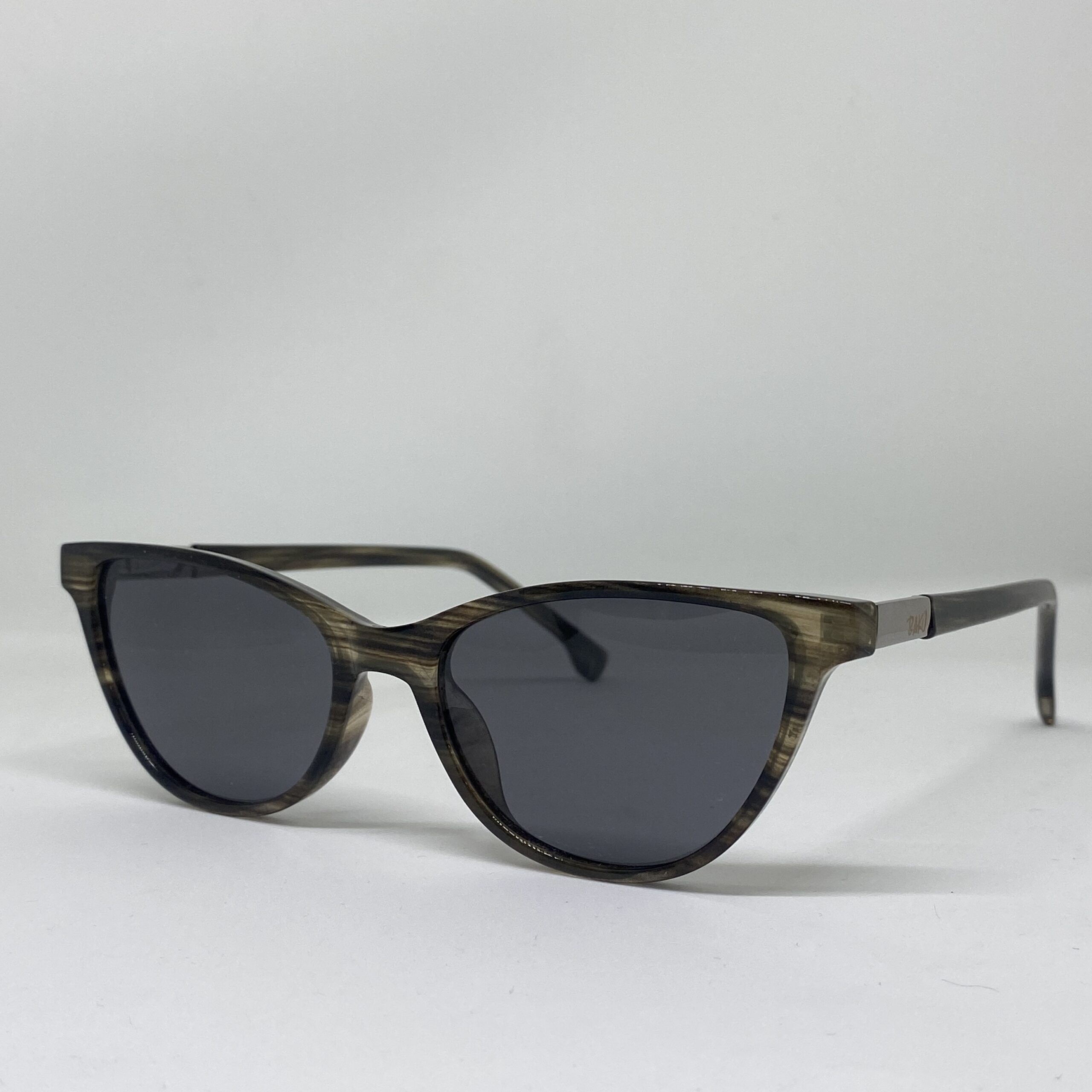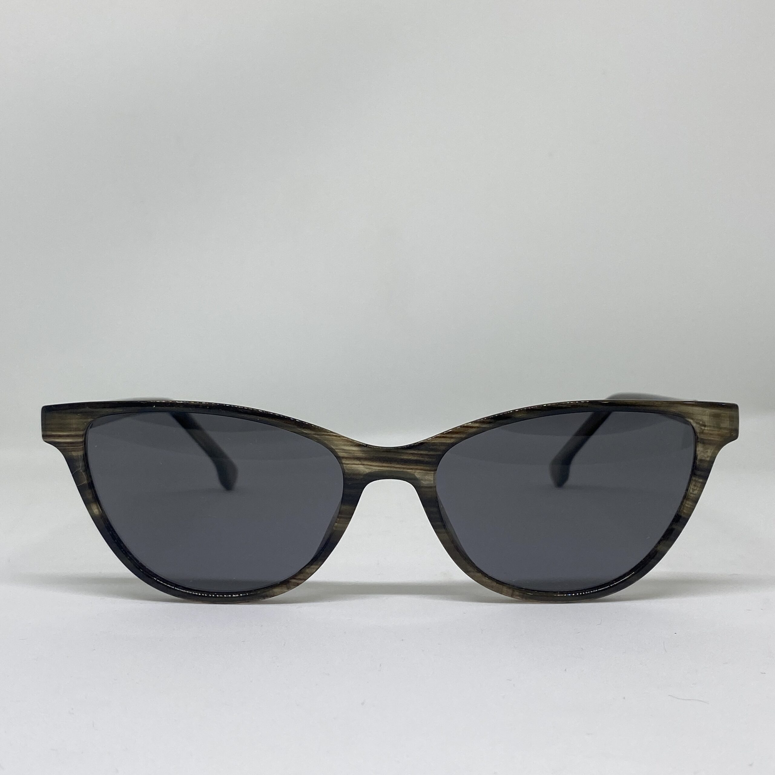 Diseño cat eye, montura en colores grises con detalles metálicos en plateado.