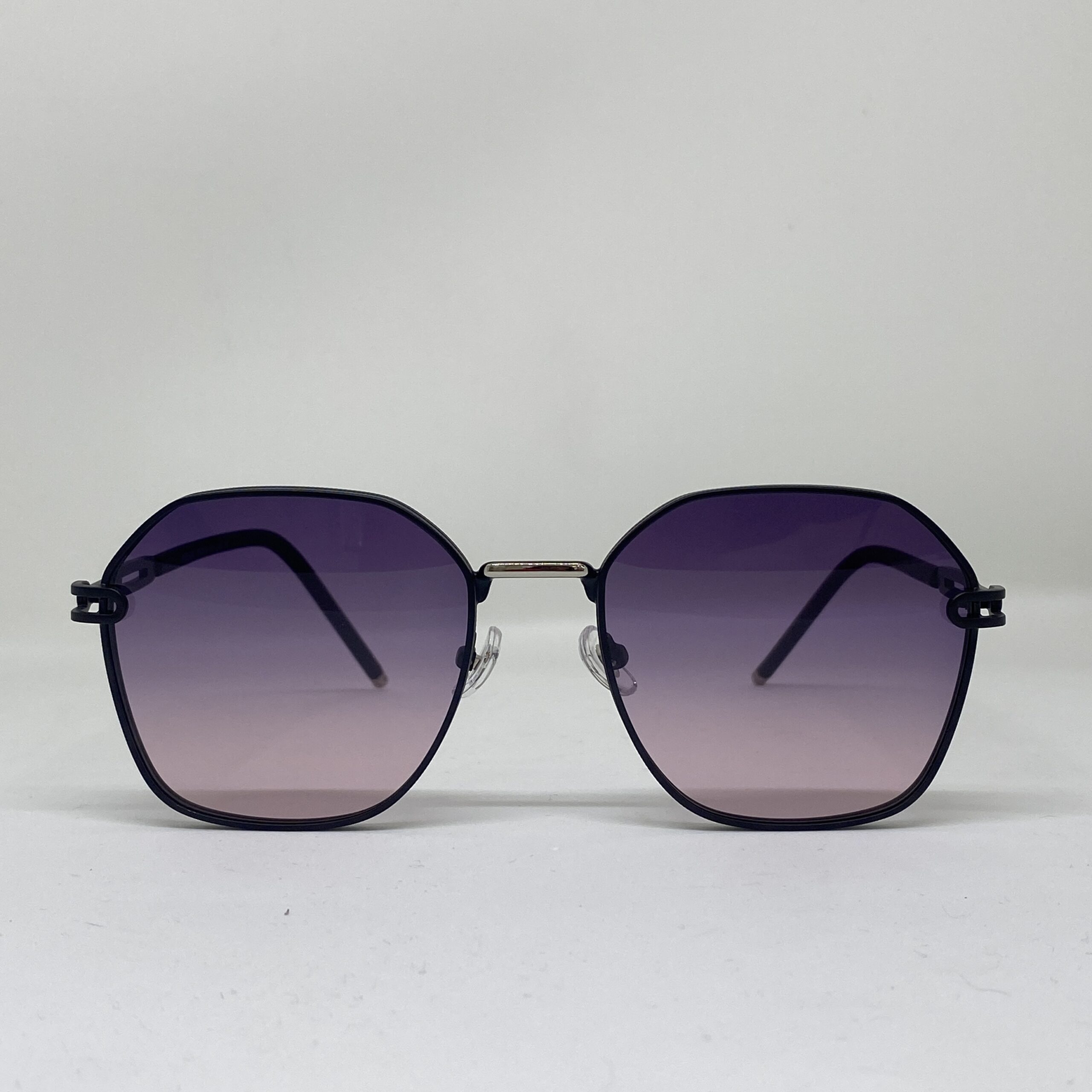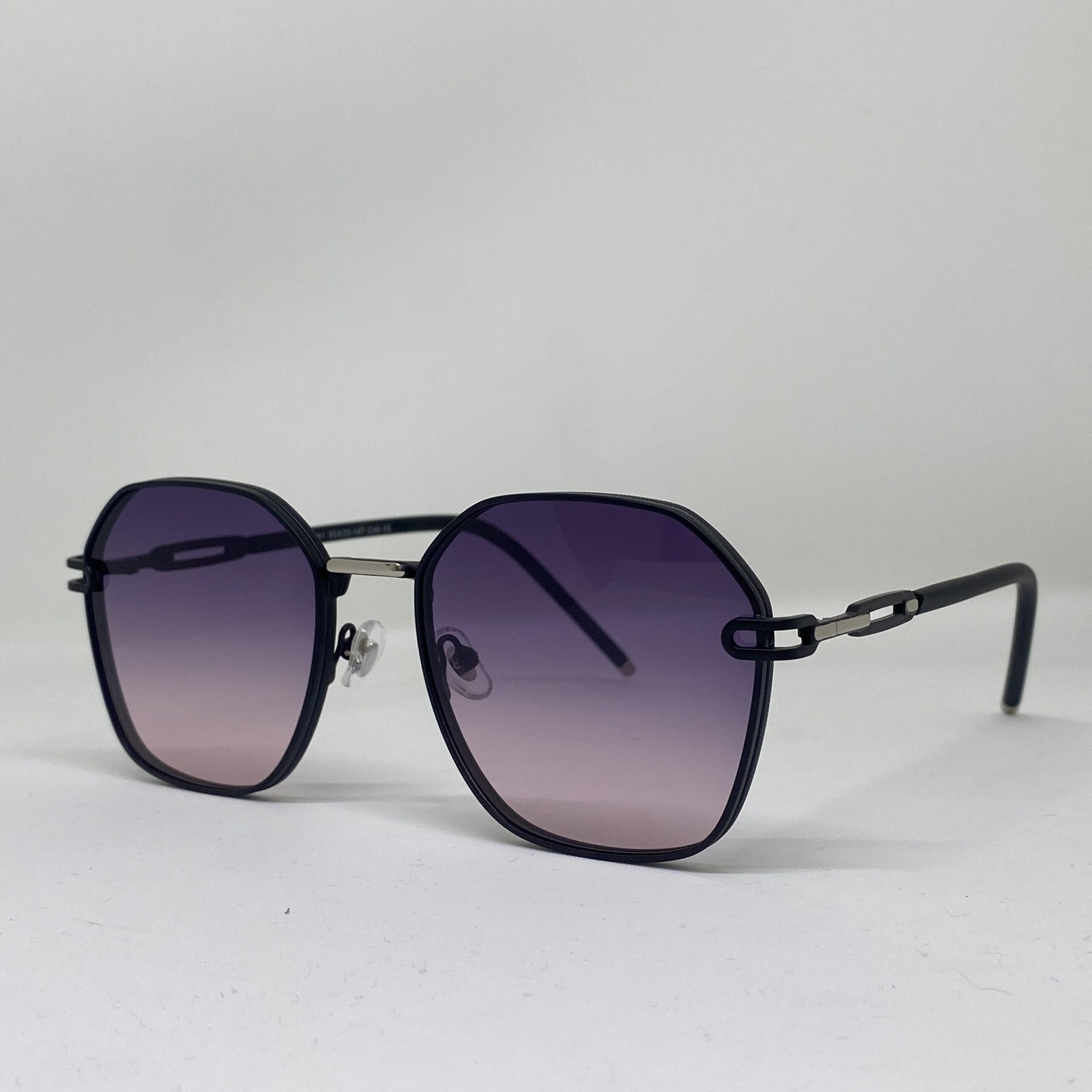 Anteojo de sol metálico con diseño geométrico, liviano, moderno y resistente. Lentes polarizados con protección UV400 y degradado violeta para una visión cómoda y sin reflejos.
