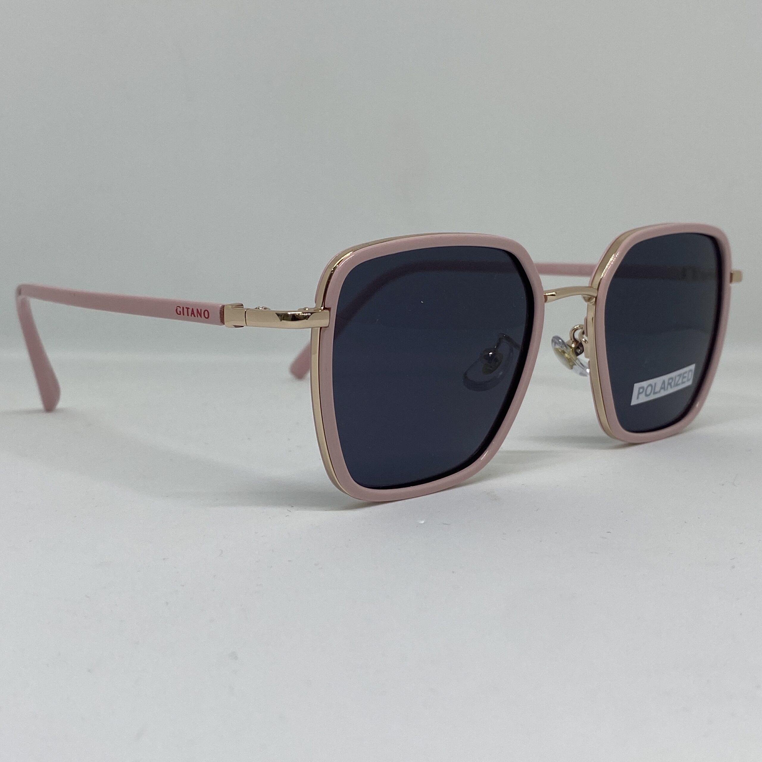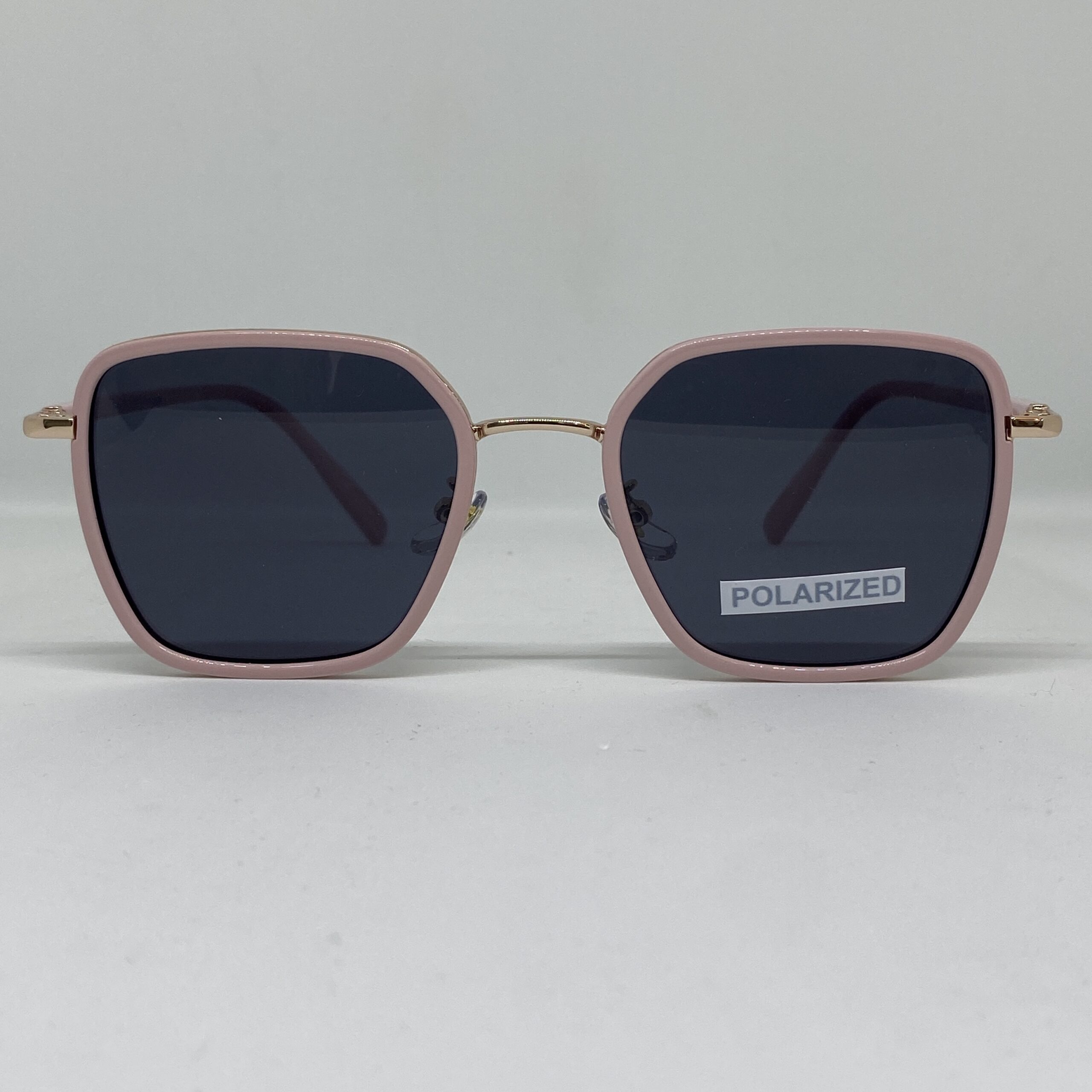 Anteojos de sol con marco rosado y detalles en dorado, lentes oscuras polarizadas y protección UV400. Livianos, elegantes y modernos.