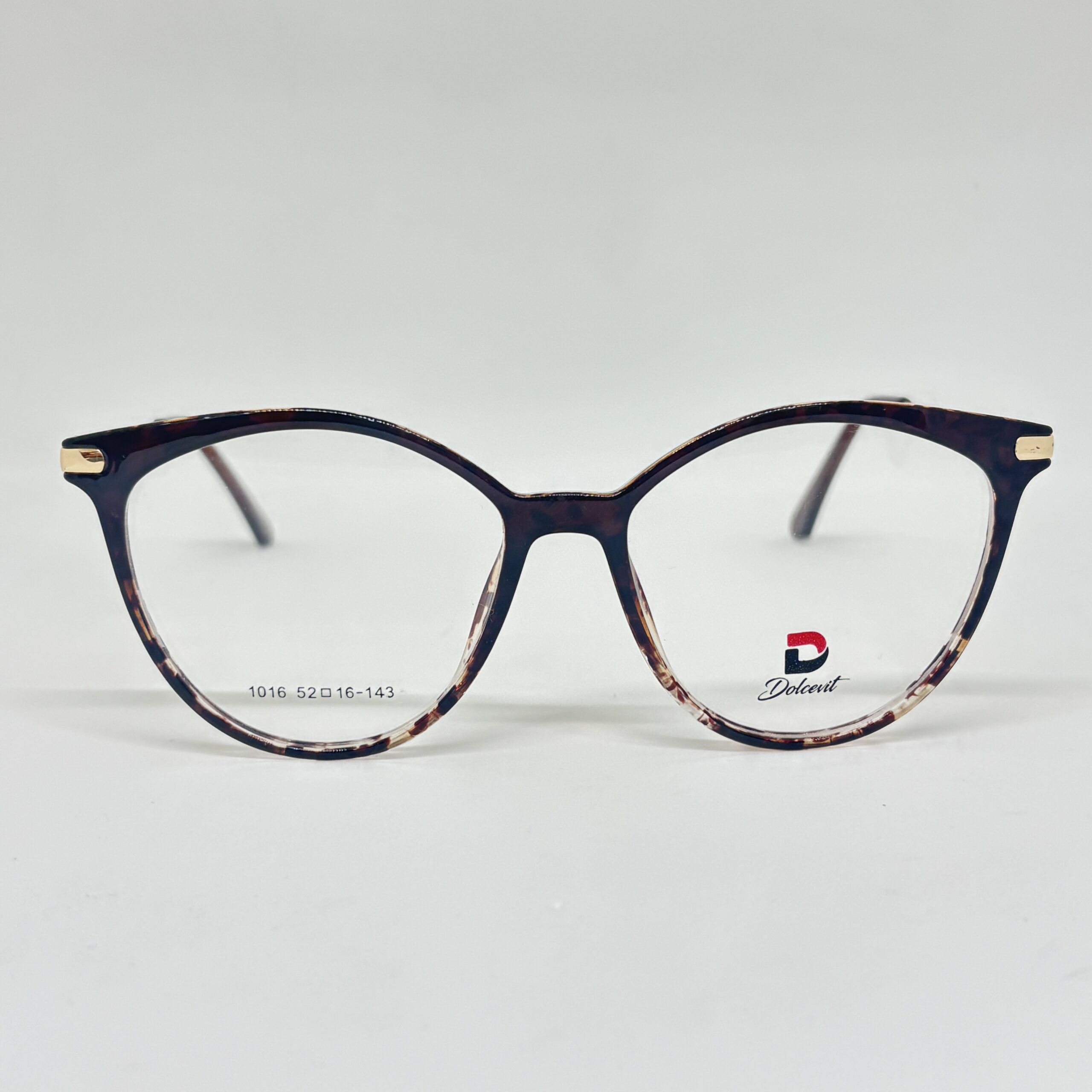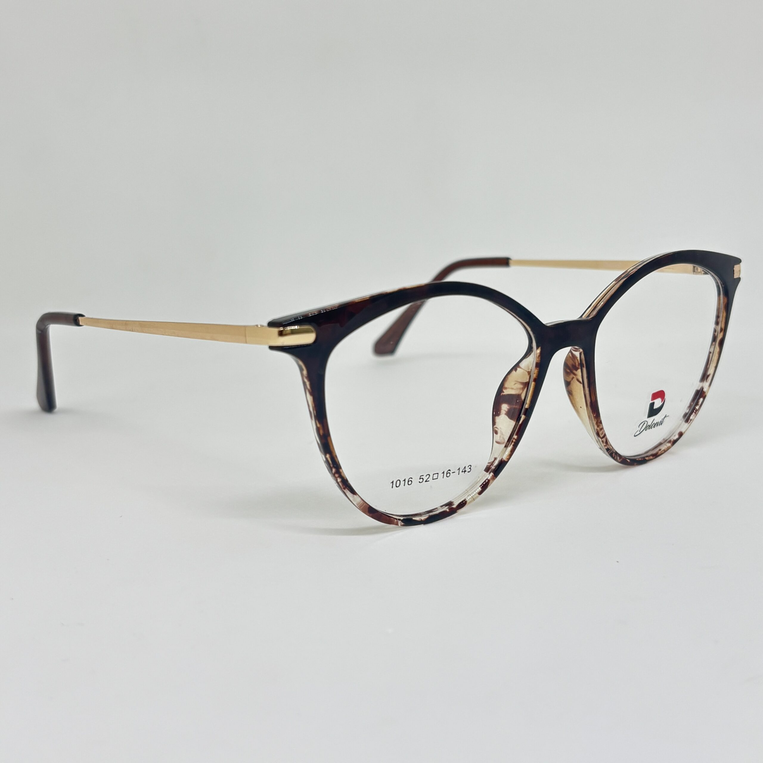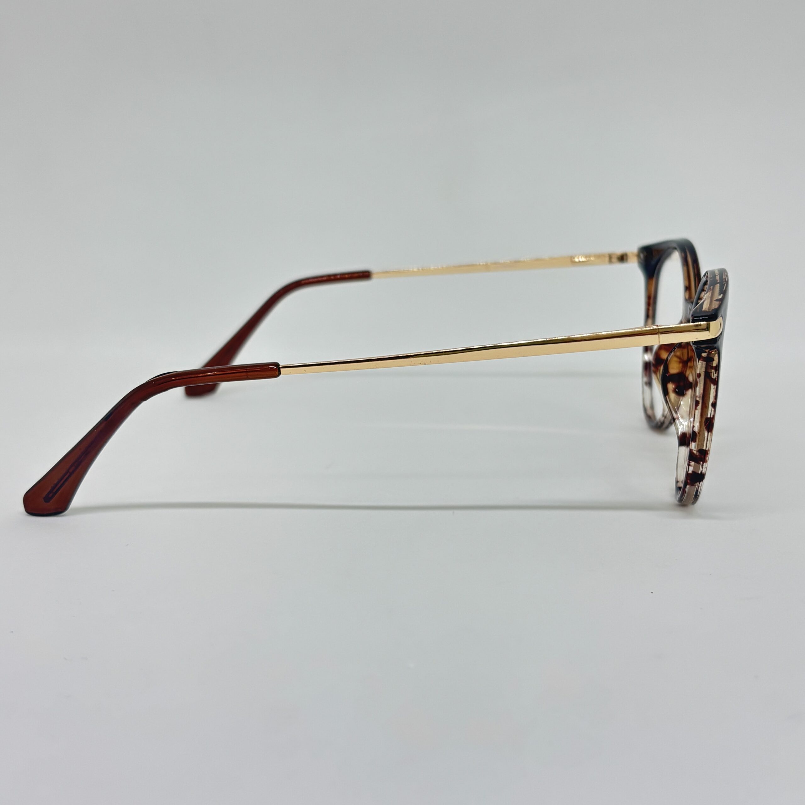 Armazón femenino de acetato con detalles carey y patillas metálicas doradas, de forma redondeada y estilo elegante