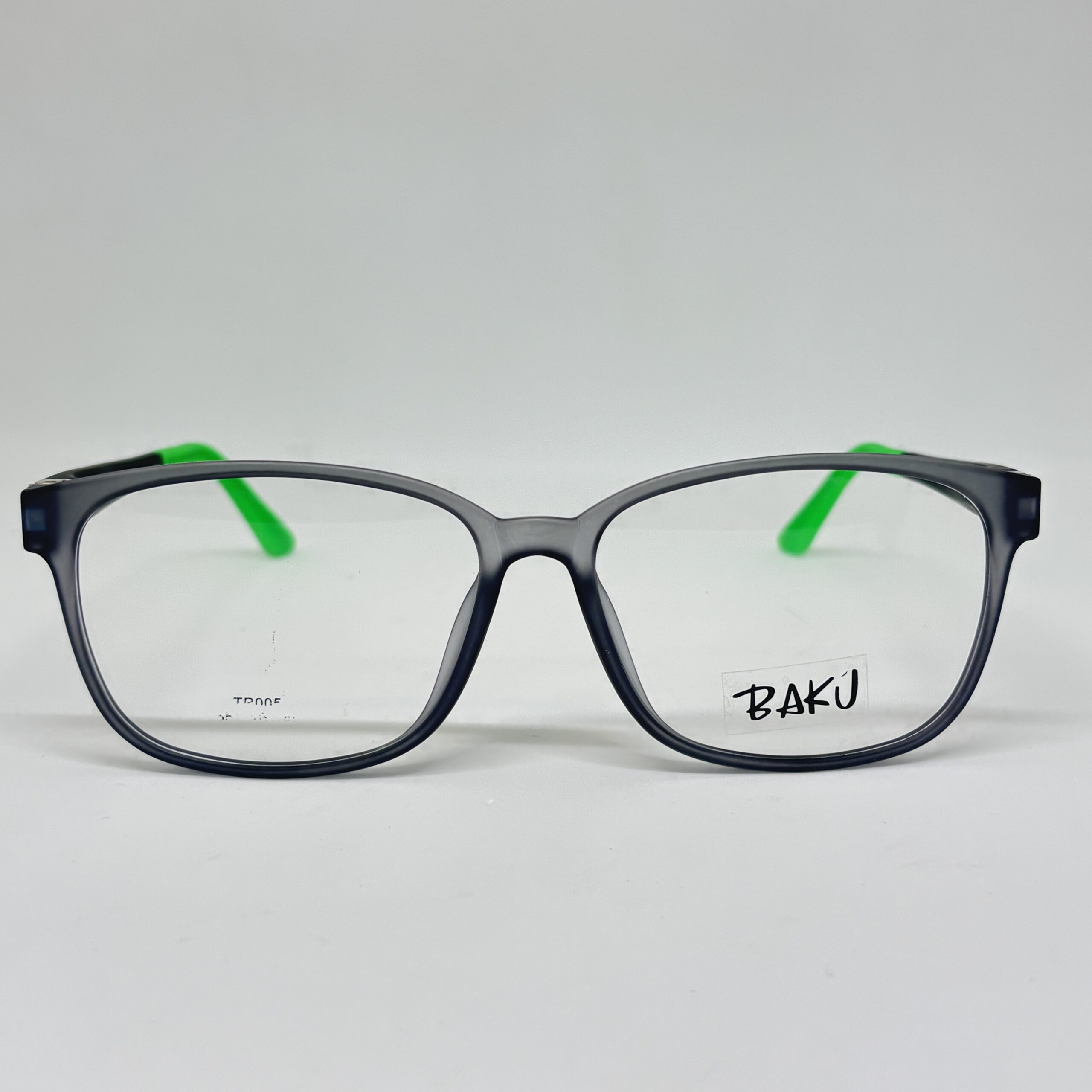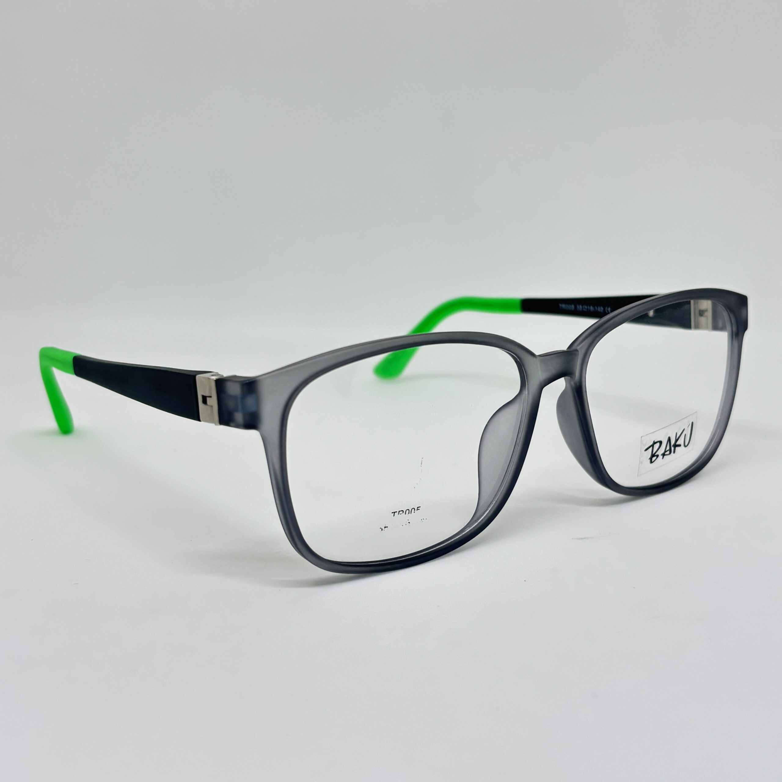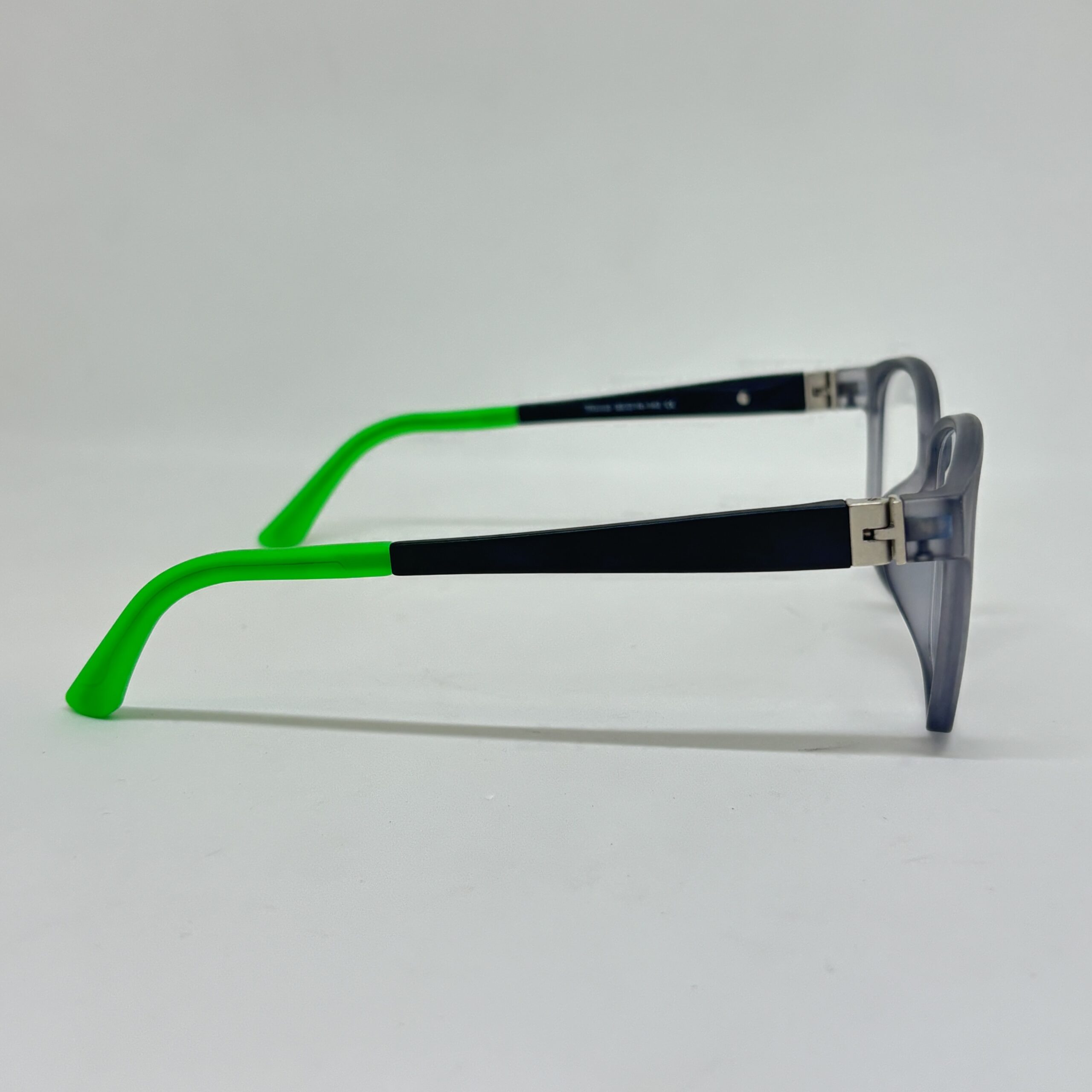 Su forma rectangular con bordes suavemente redondeados aporta equilibrio entre estilo y comodidad, adaptándose fácilmente a distintos tipos de rostro. El frente en tono gris translúcido le da una estética liviana y actual, mientras que las patillas en contraste, con detalles en negro y terminales en verde, suman personalidad y un look más deportivo.