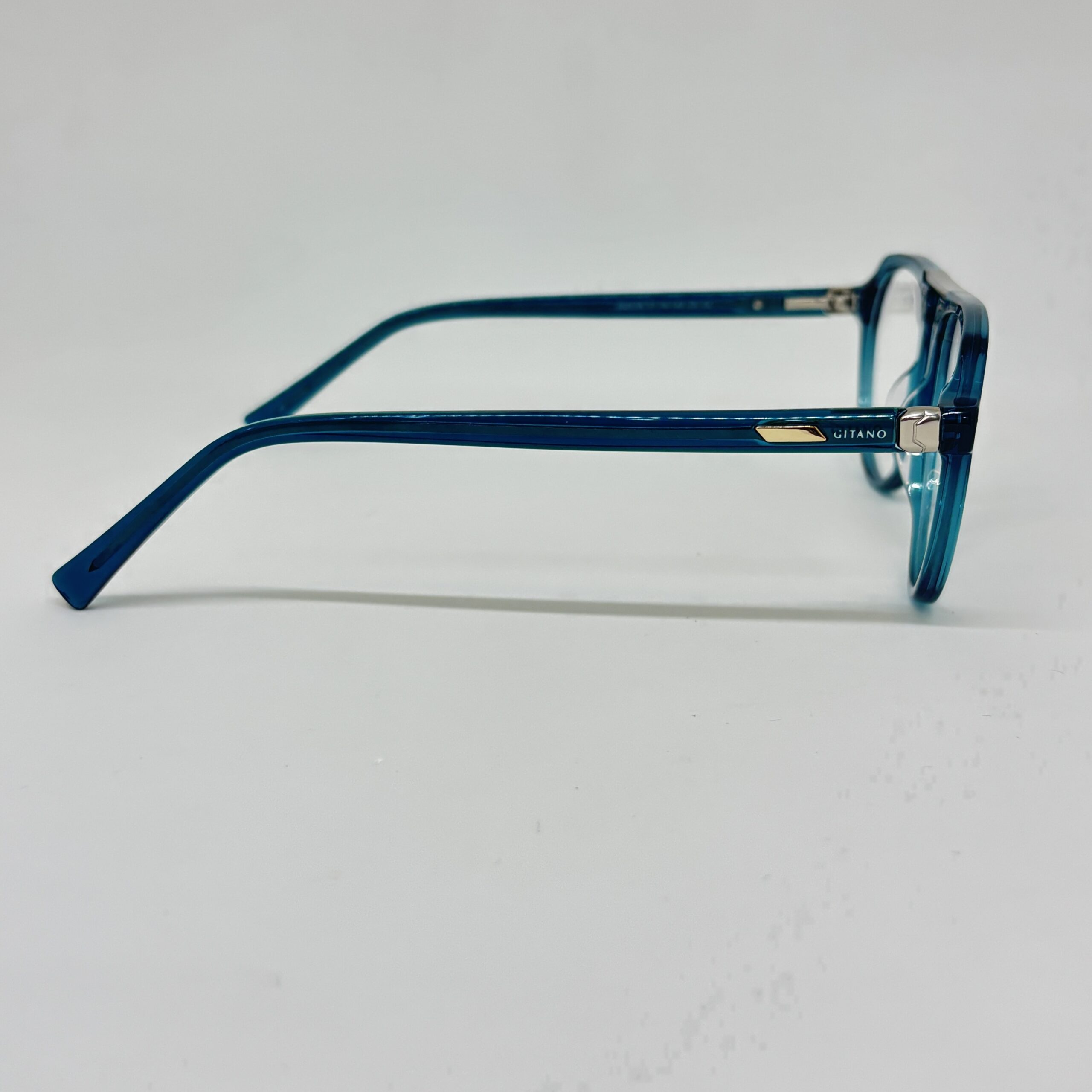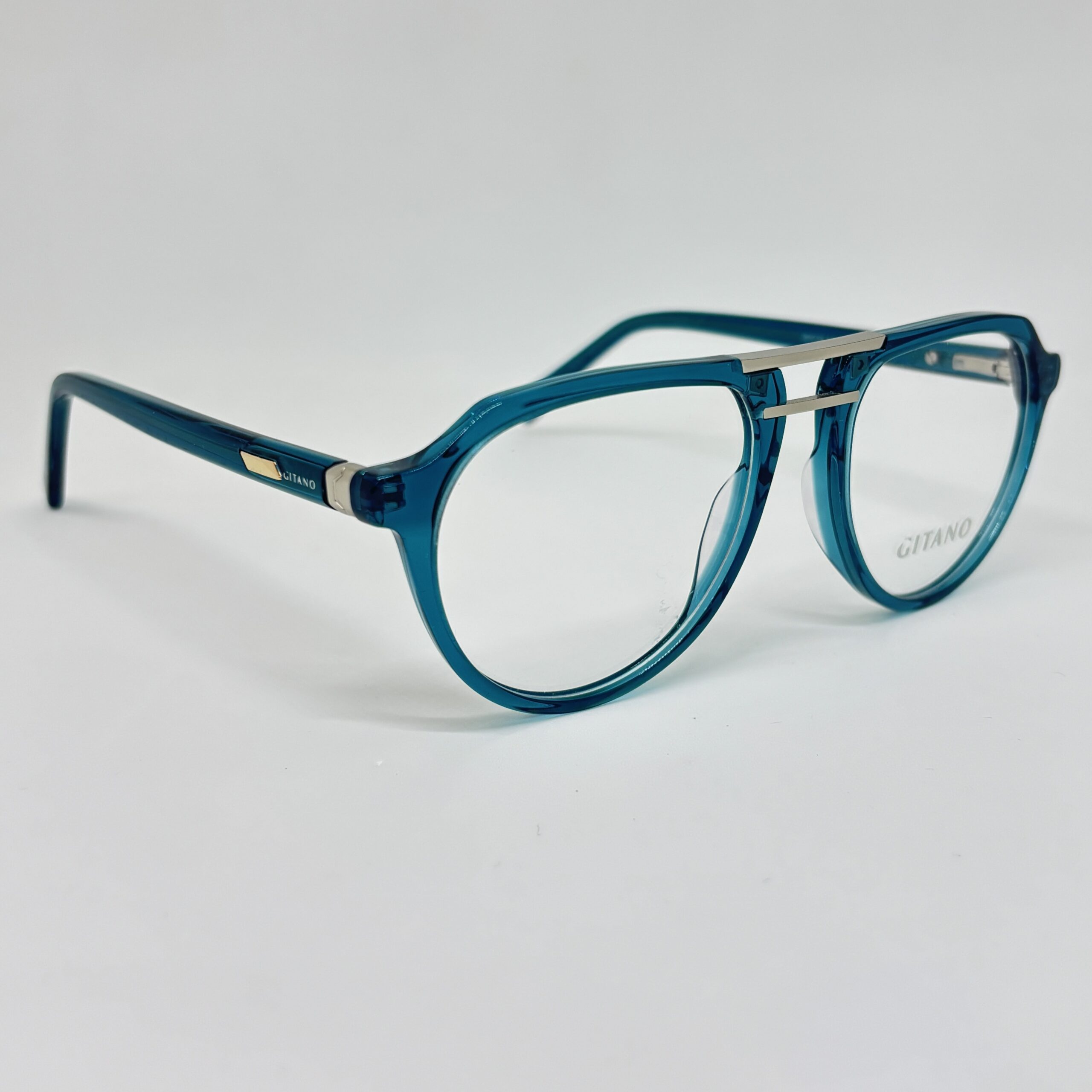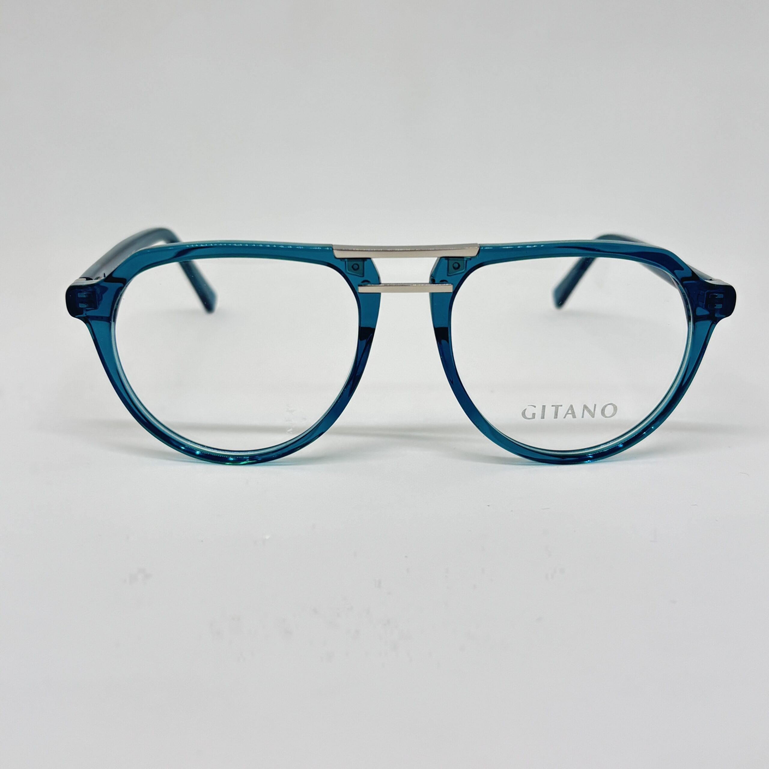 Armazón redondeado en celeste azul traslúcido con doble puente metálico plateado, moderno, liviano y elegante para uso diario.