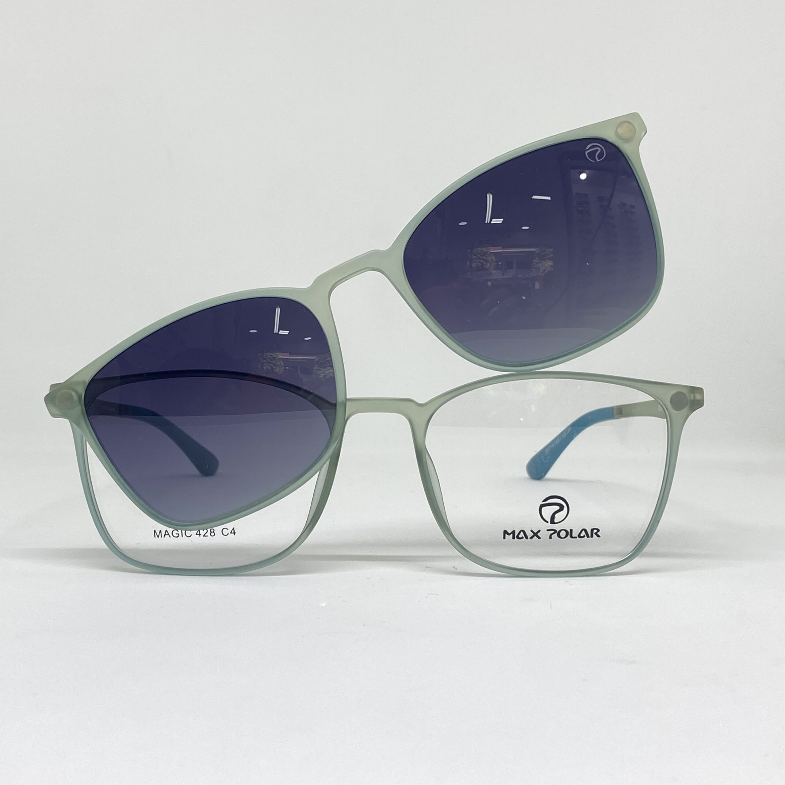 Este armazón con clip-on solar es la opción perfecta para quienes buscan un diseño moderno y práctico. Su tamaño mediano a pequeño lo hace ideal para rostros de diferentes tamaños, brindando comodidad y ajuste perfecto. El frente de color verde translúcido, combinado con el clip-on en tonos azul, le da un estilo único y fresco que resalta por su simplicidad y elegancia.