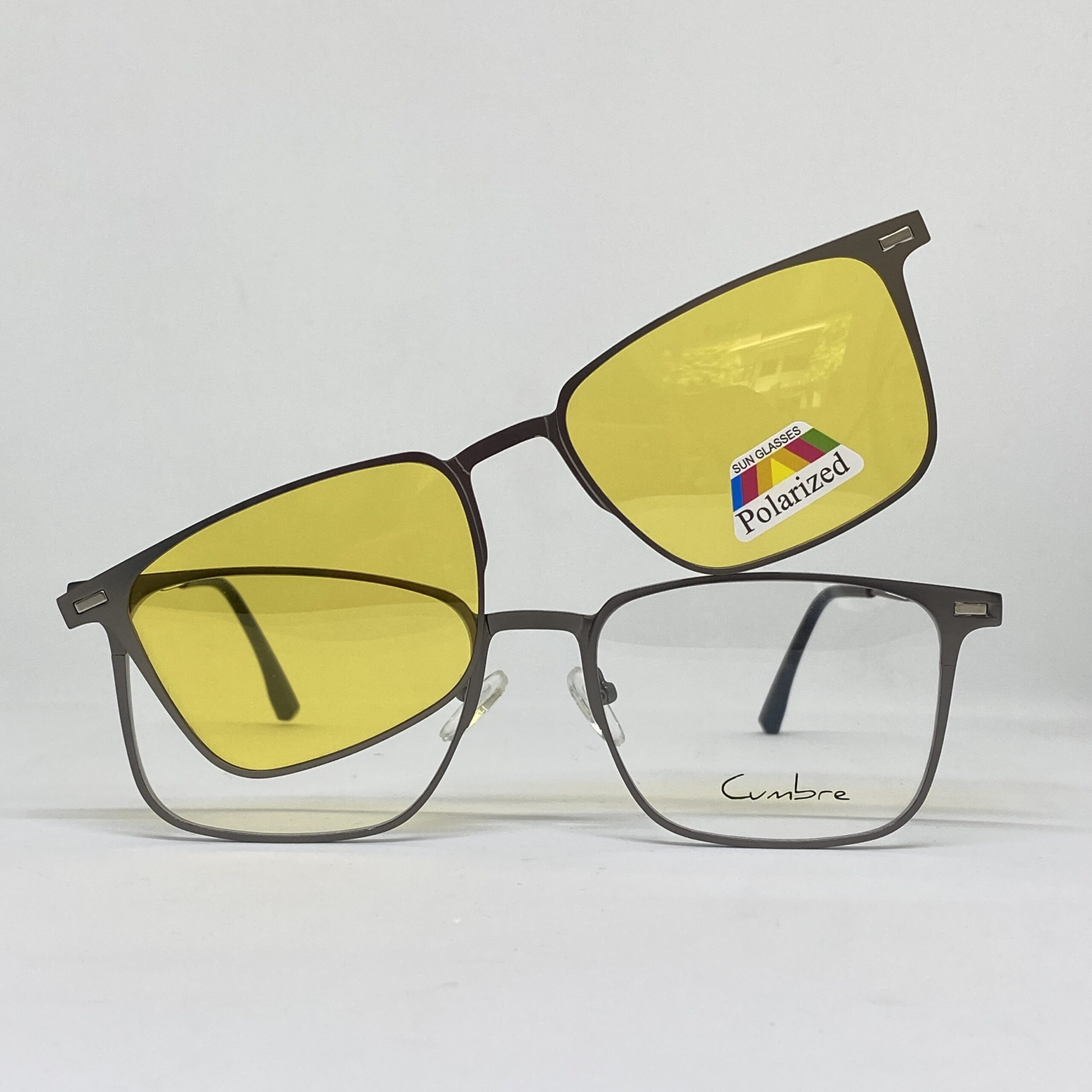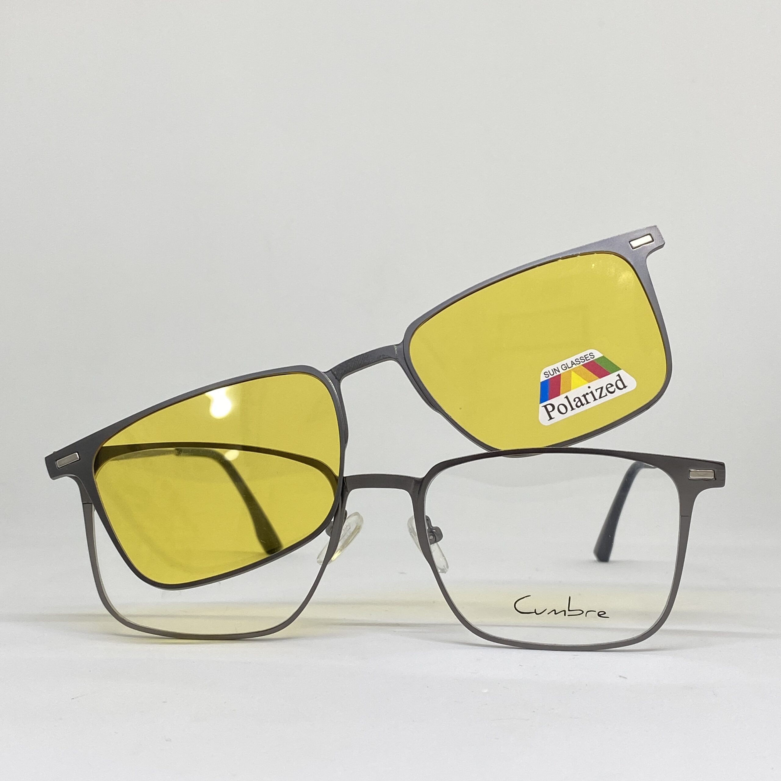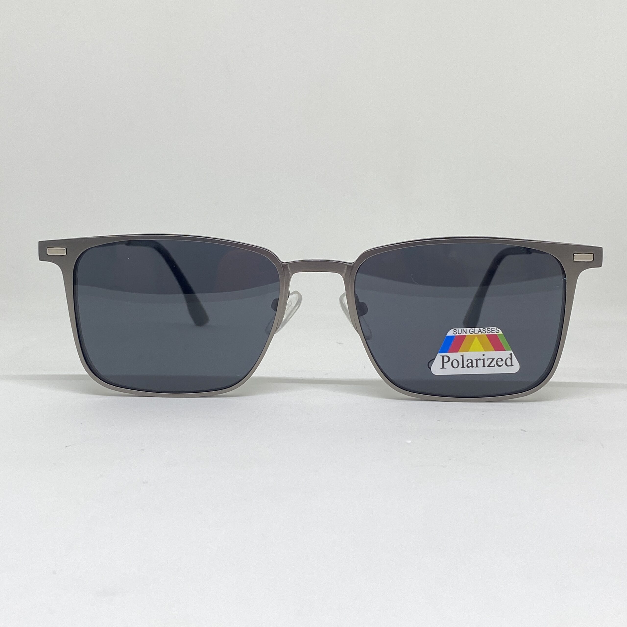 Armazón rectangular en color gris con doble clip-on solar intercambiable, ambos polarizados y con protección UV400. La solución ideal para combinar anteojos recetados y de sol en un solo producto, adaptándose a distintas condiciones de luz.
