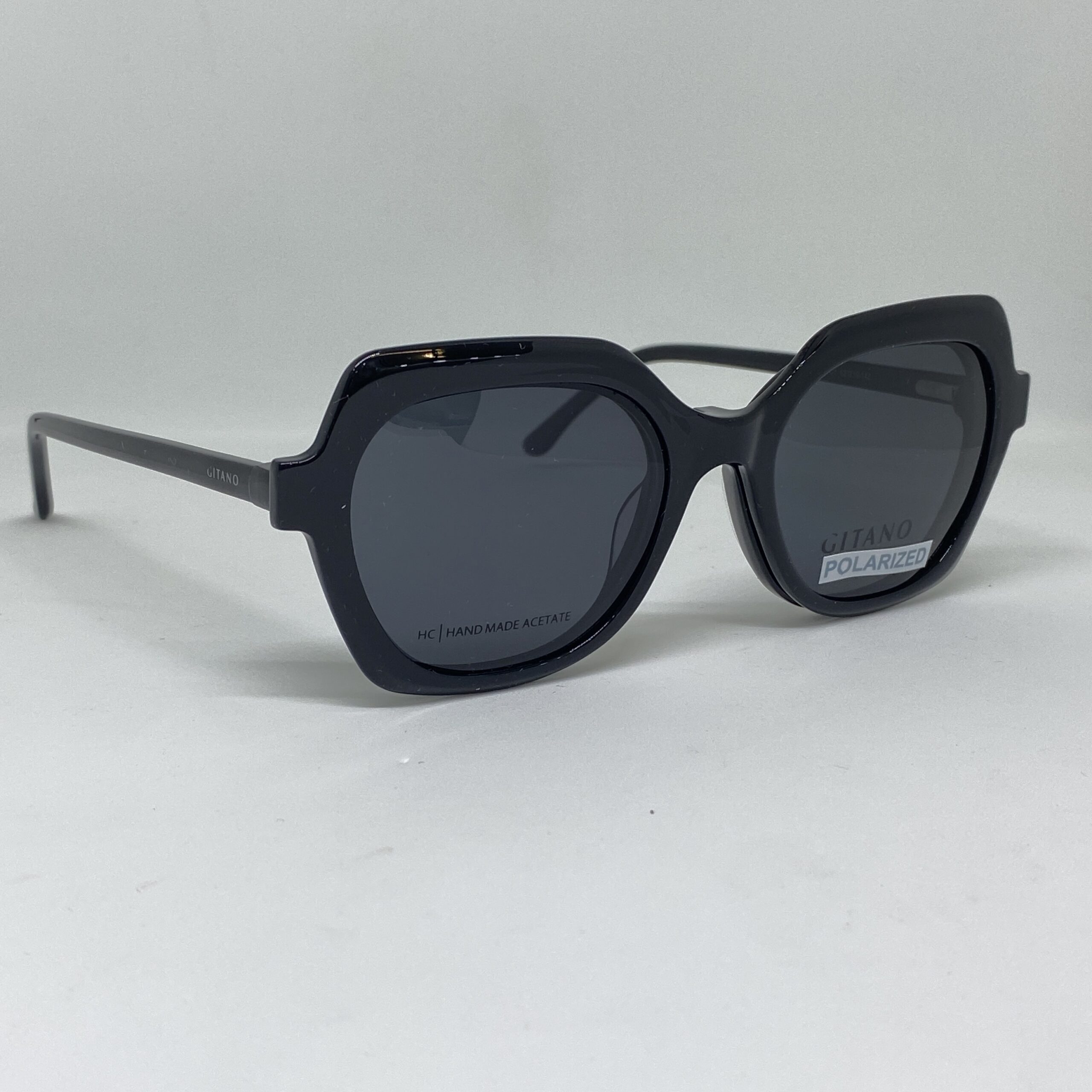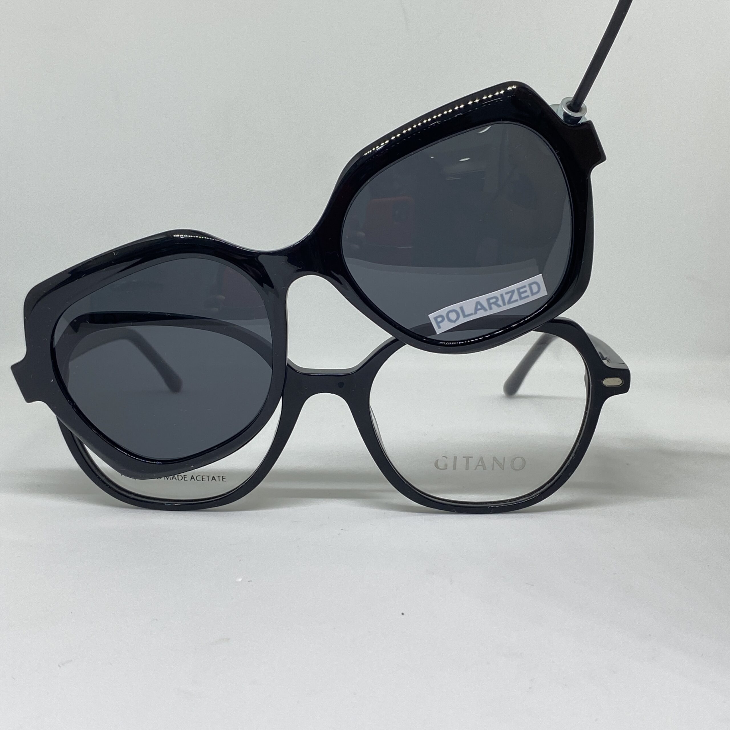 Armazón de acetato negro con clip-on magnético polarizado. Diseño envolvente y moderno que se transforma en anteojo de sol , ofreciendo reducción de reflejos y protección UV400 para un confort visual superior.