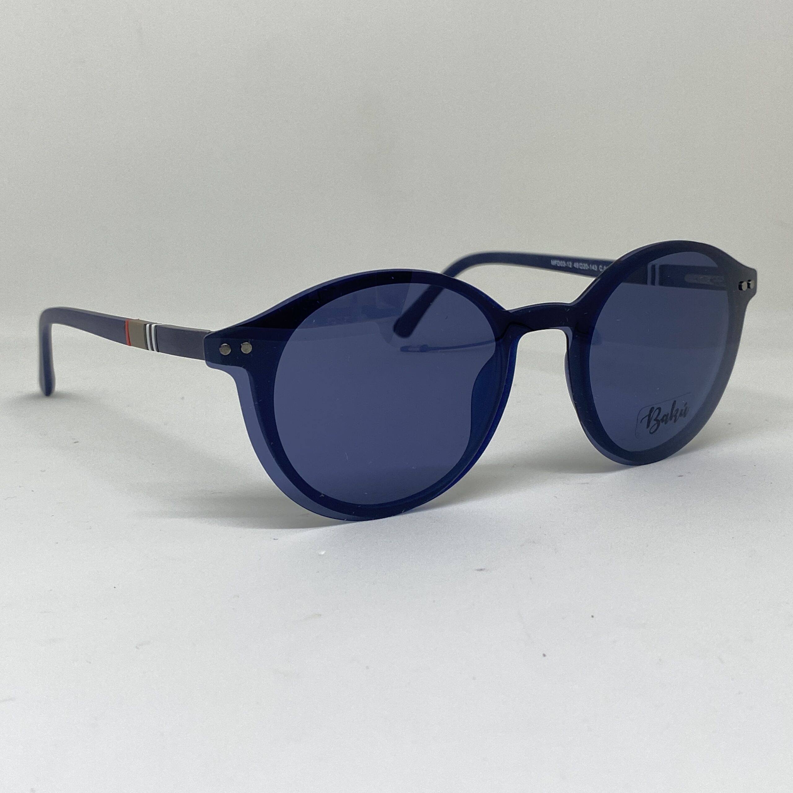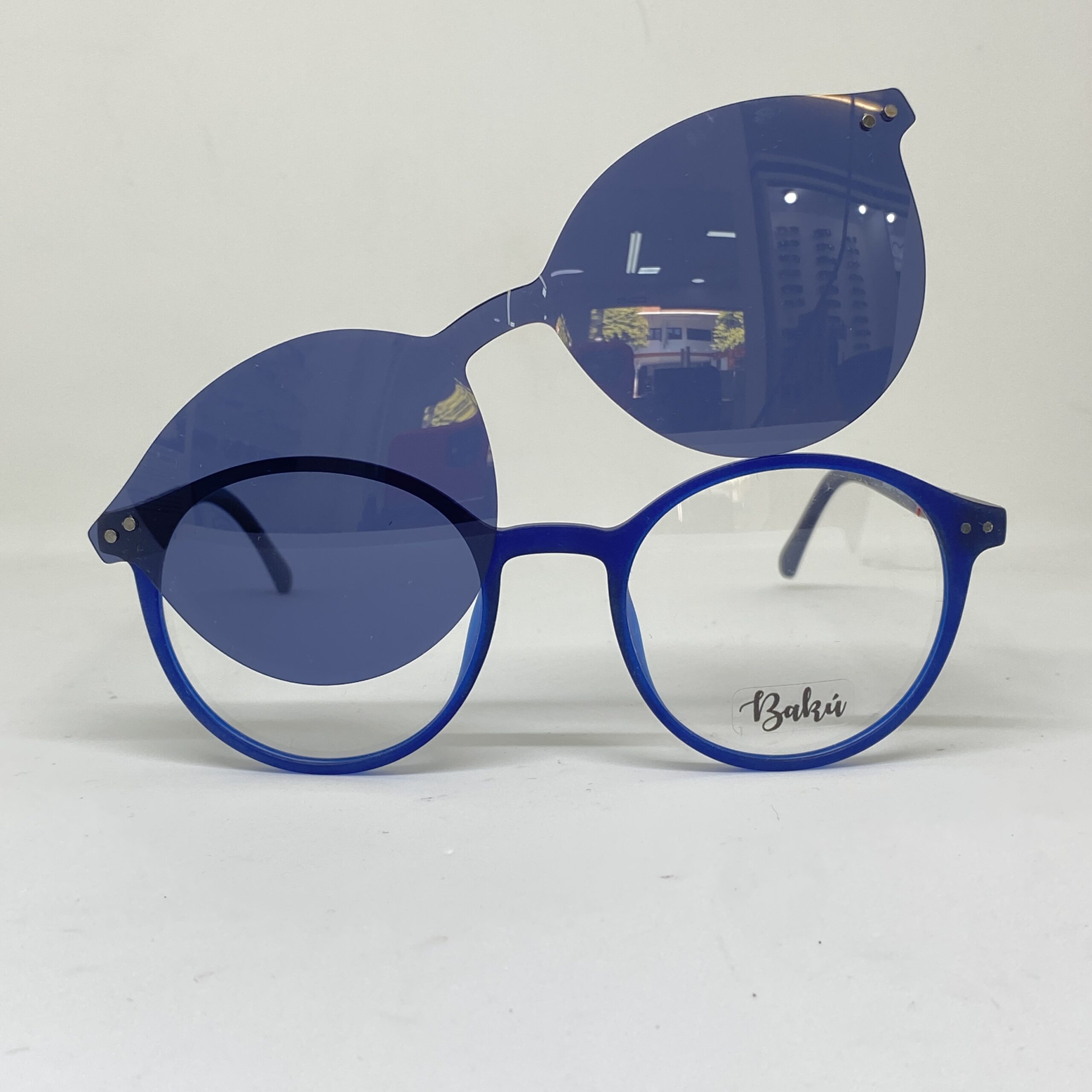 El clip-on se acopla magnéticamente al frente del anteojo, transformándolo en un anteojo de sol de forma inmediata. Sus lentes en tono azul reducen el deslumbramiento y mejoran el confort visual en ambientes exteriores, ofreciendo una protección efectiva frente a la luz solar.