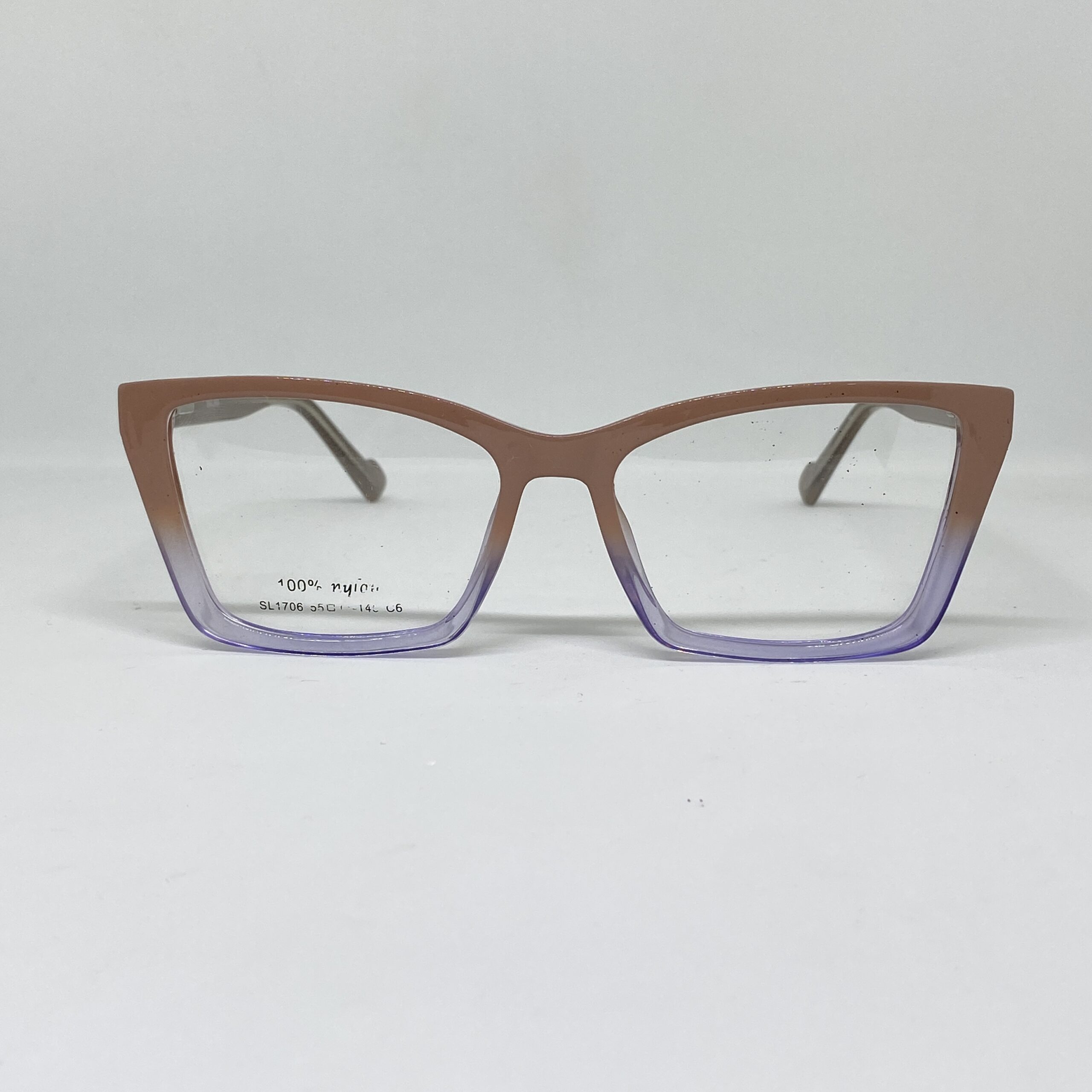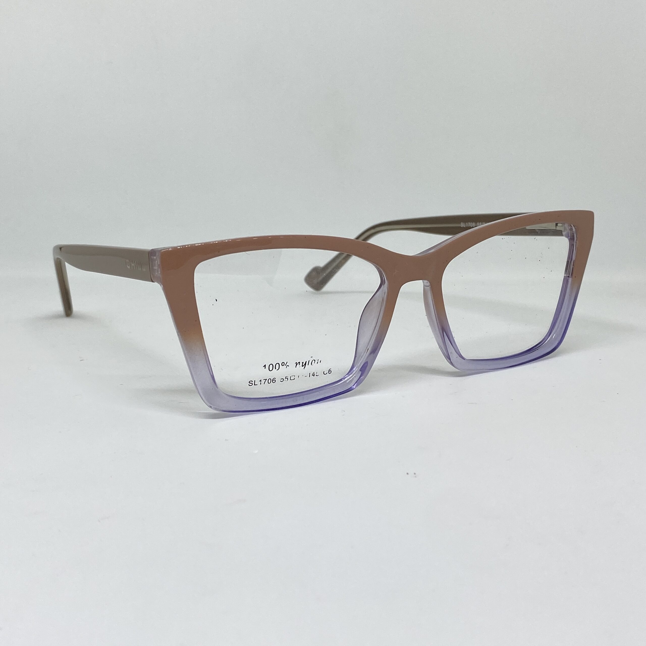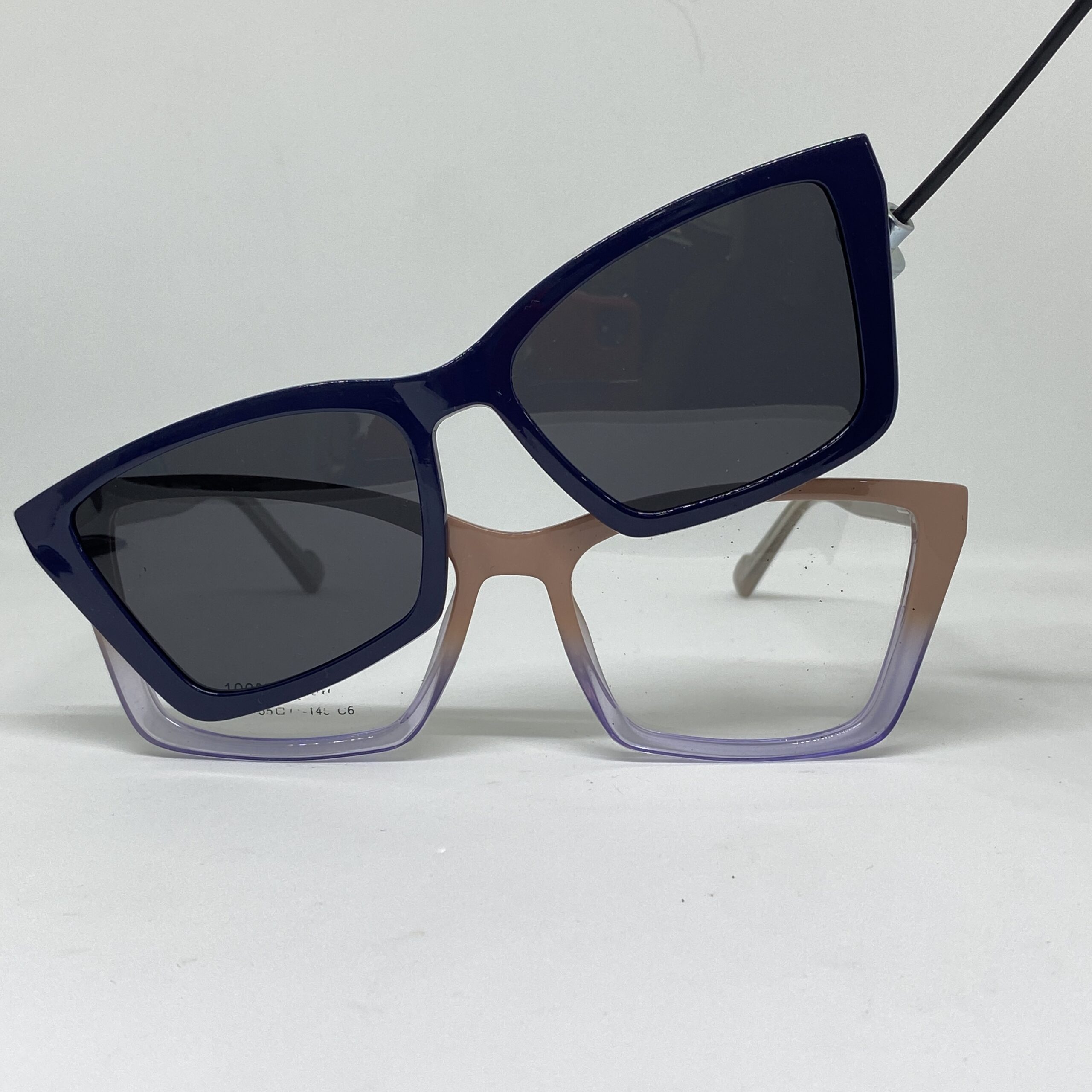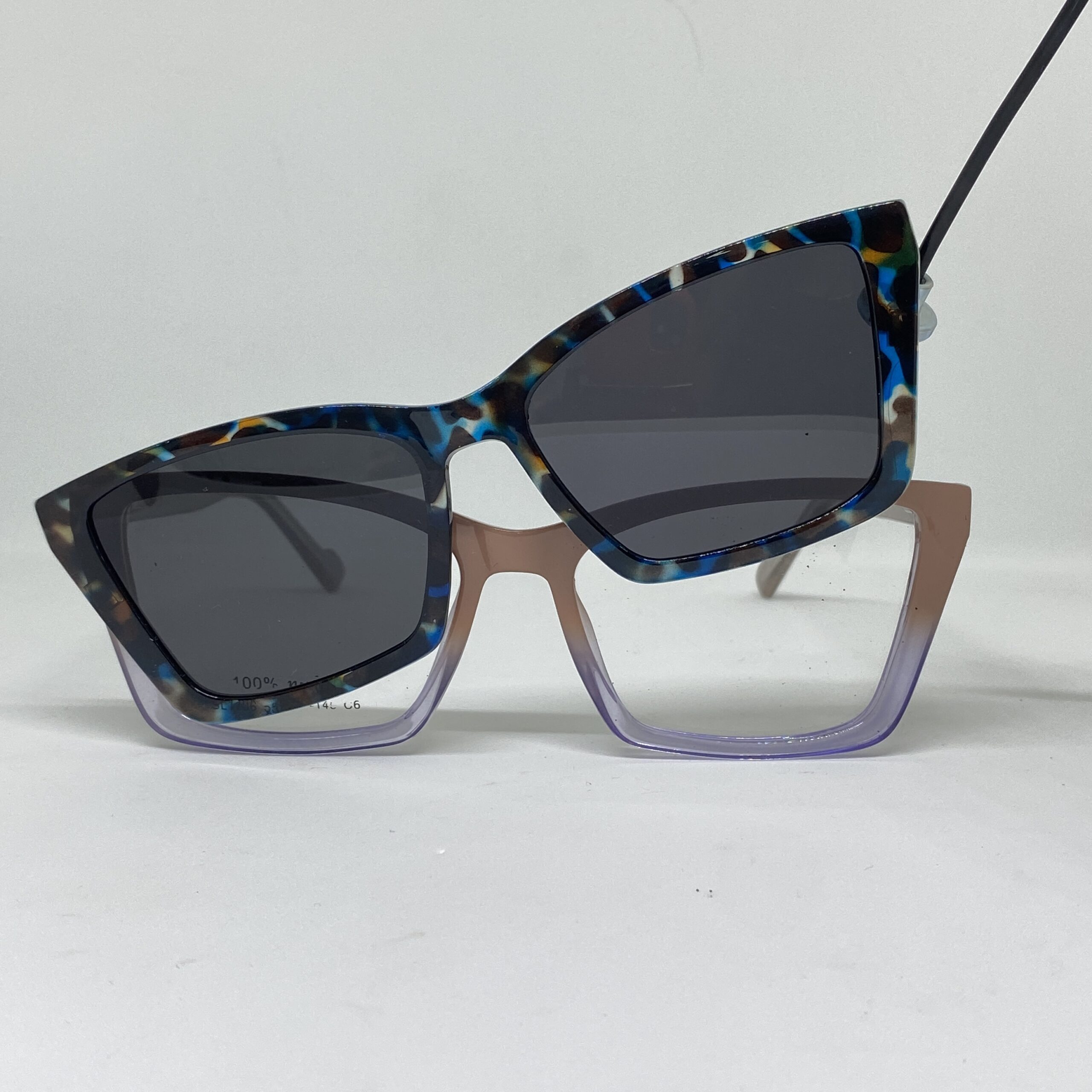 Este modelo se destaca por su diseño moderno y original, ideal para quienes buscan un anteojo diferente y con mucha personalidad. El armazón combina una base traslúcida con degradé en tonos nude y lila, aportando ligereza visual y un look actual, mientras que el frente superior suma un estampado tipo carey multicolor con predominio de azules, que le da un toque sofisticado y distintivo.