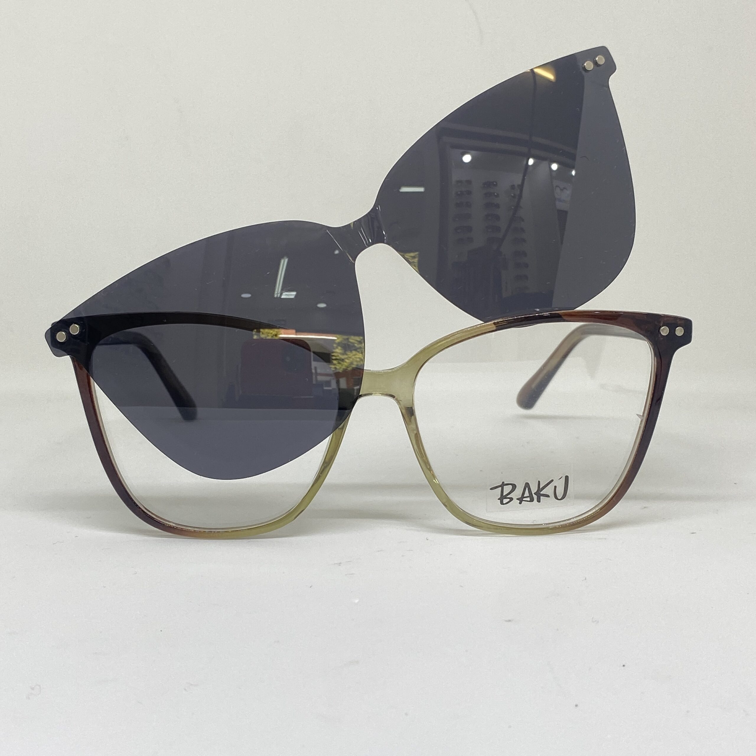 Armazón de acetato en tonos verde oliva y marrón con clip-on solar magnético polarizado. Protección UV400 y diseño cómodo que se adapta fácilmente a distintas condiciones de luz.