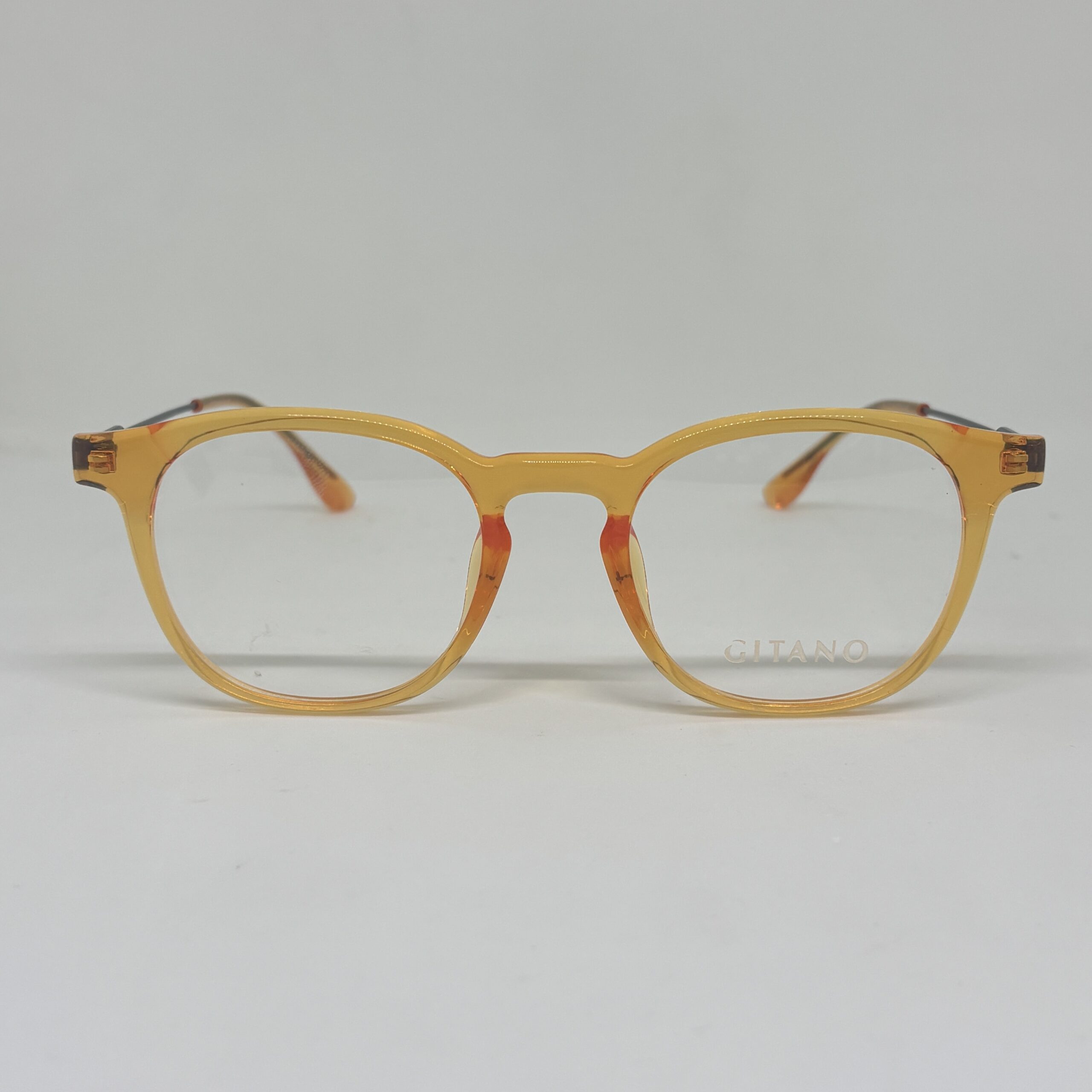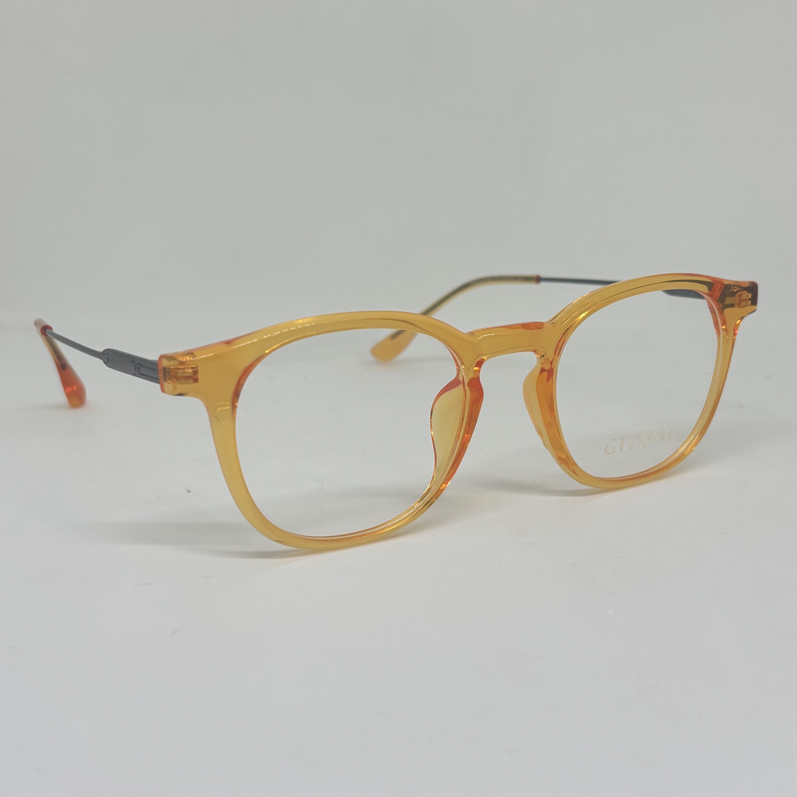 En cuanto al color, el frente combina un tono naranja traslúcido con matices cálidos, que aporta luminosidad y un estilo distintivo. La transparencia del acetato le da profundidad al diseño, mientras que las patillas en tono oscuro generan un contraste sutil que refuerza su carácter moderno y original.