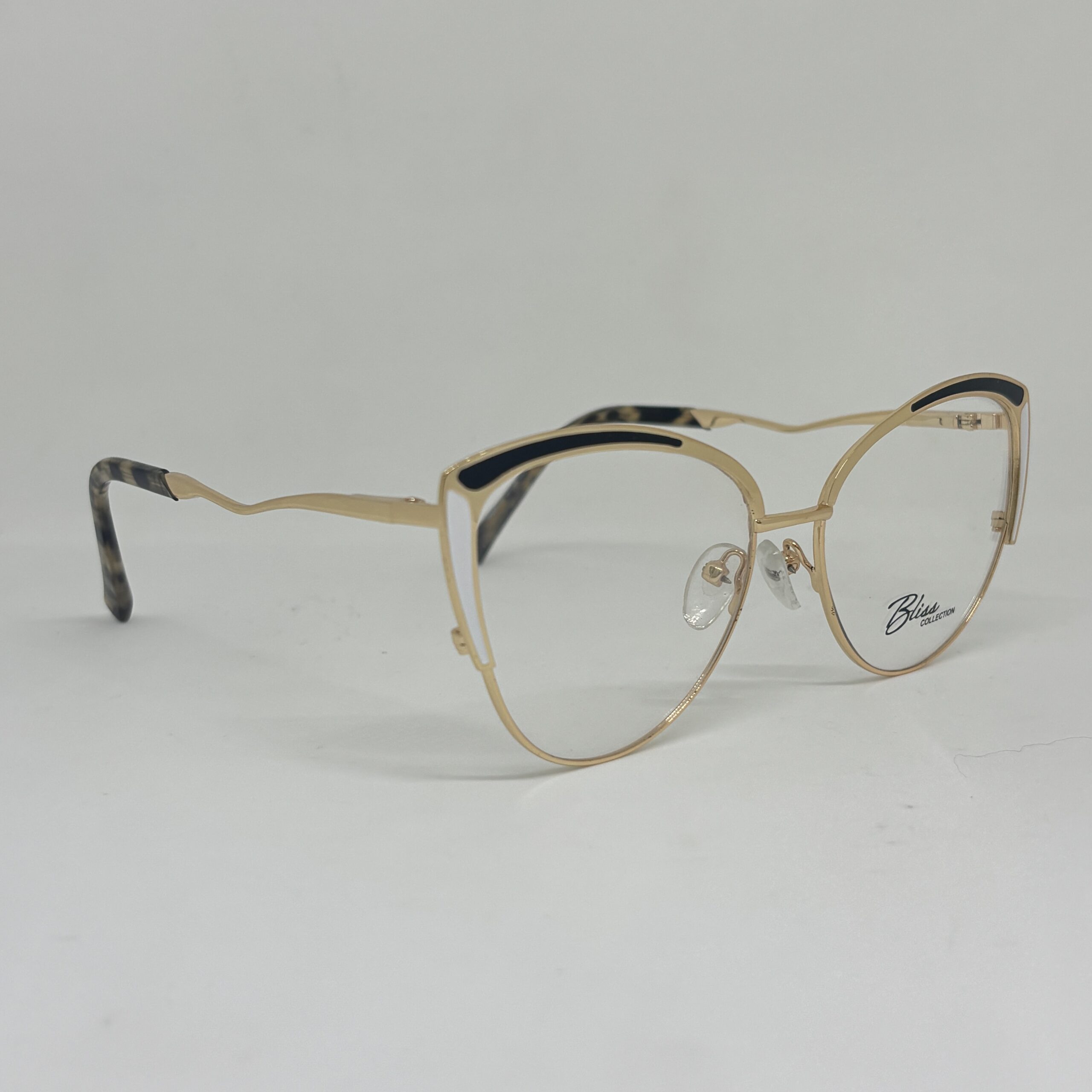 El frente presenta una estructura metálica en tono dorado brillante, combinada con un detalle superior en color negro esmaltado, que genera un contraste delicado pero con mucha personalidad. Este detalle resalta la línea cat eye y aporta un acabado más exclusivo y elegante.