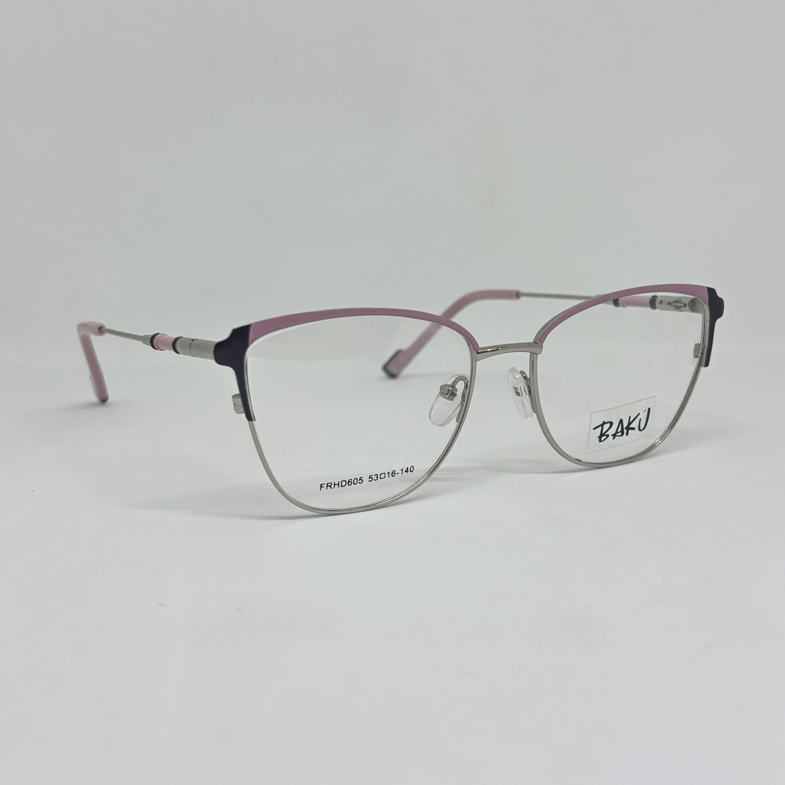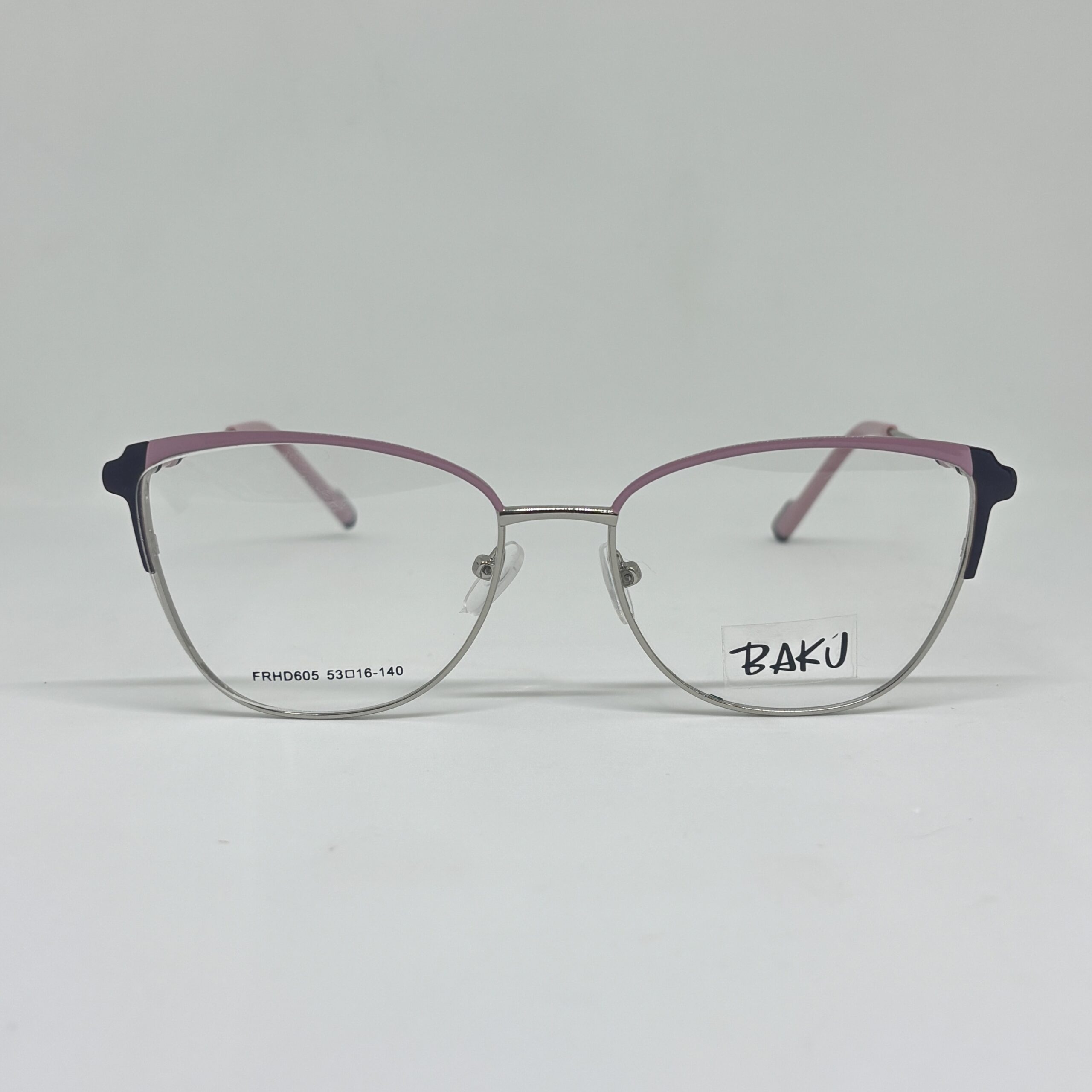 El frente se presenta en un tono plateado claro, combinado con un delicado acabado rosa suave en la parte superior, logrando un contraste fino y sofisticado que realza la mirada sin ser recargado. En los laterales del frente se destacan detalles en tono oscuro, que aportan profundidad al diseño y un toque contemporáneo.
