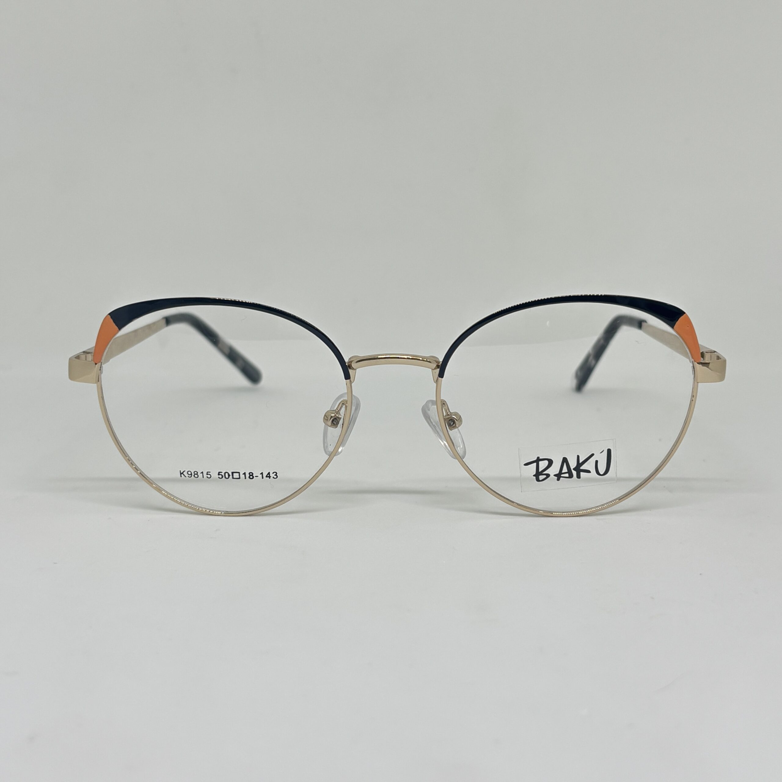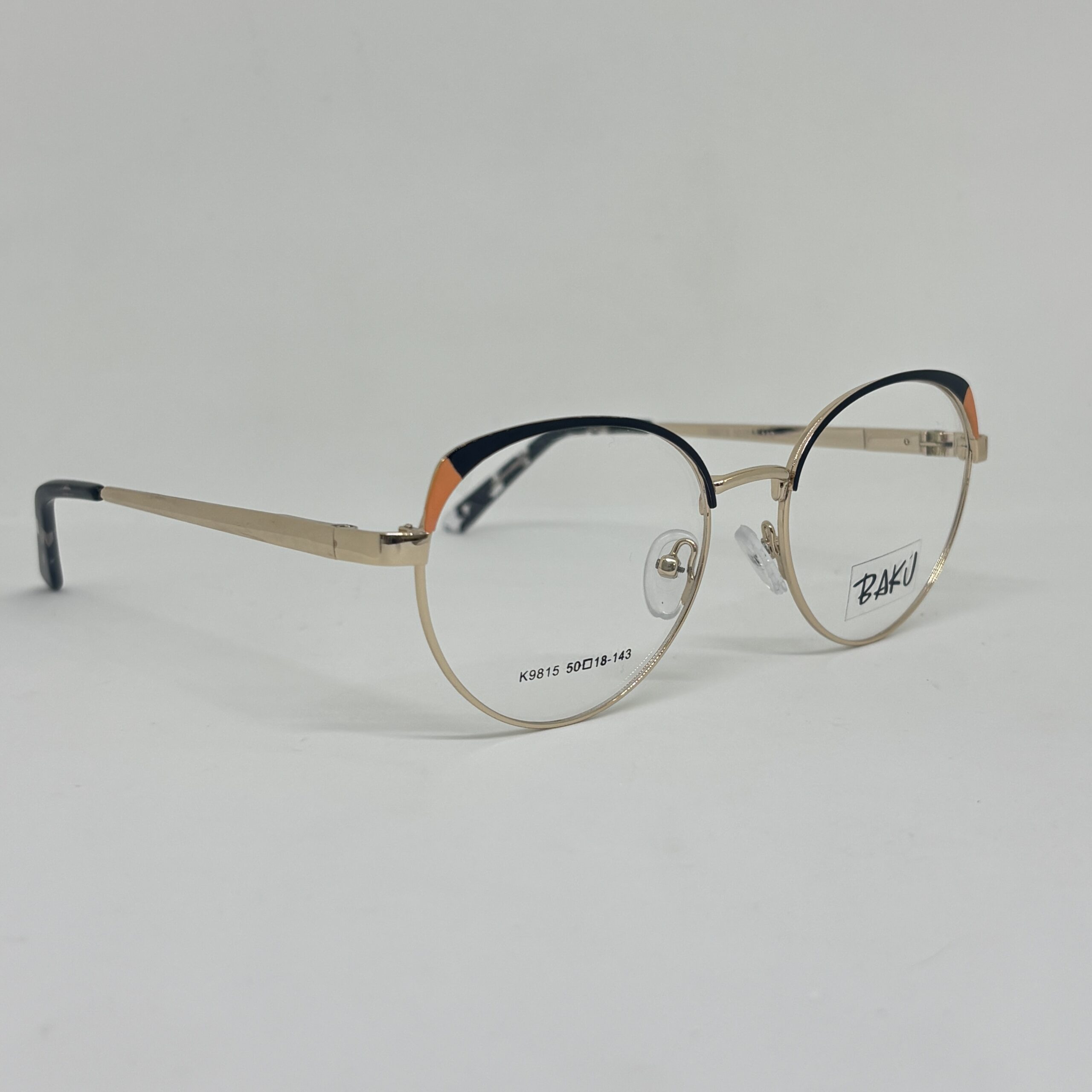 Armazón metálico redondeado en color dorado, con detalle superior en tono naranja, liviano, elegante y cómodo para todos los días.