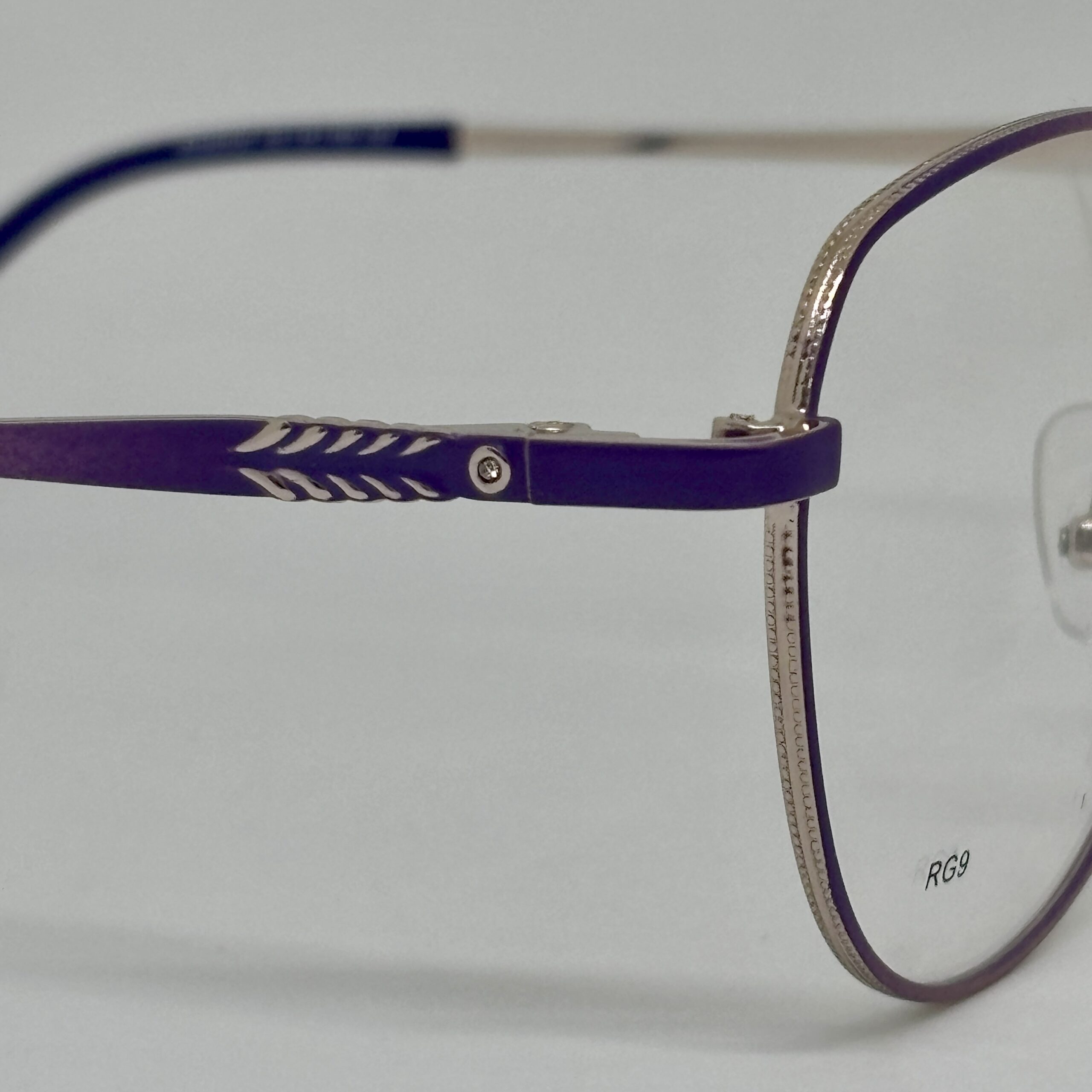 Cuenta con plaquetas nasales regulables que aseguran un calce cómodo y personalizado, permitiendo un uso prolongado durante el día. Las varillas metálicas en tono violeta, con terminales a juego, completan el conjunto aportando continuidad estética, ligereza y resistencia.