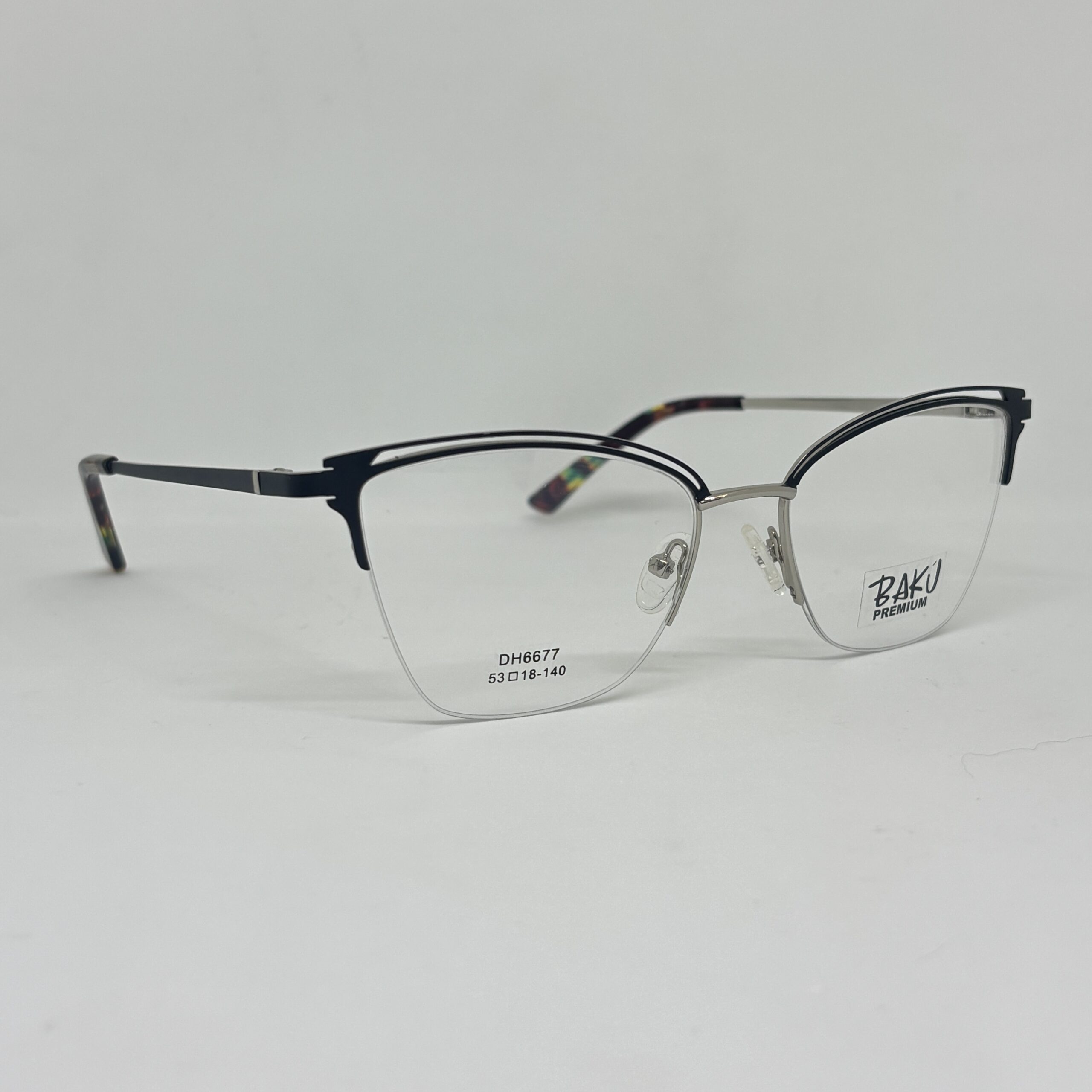 Armazón de diseño moderno y refinado, que combina una estructura metálica liviana con un detalle superior en color negro que aporta contraste y definición al frente. Su forma suavemente elevada en la parte superior realza la mirada sin exagerar, logrando un equilibrio ideal entre elegancia y sobriedad.